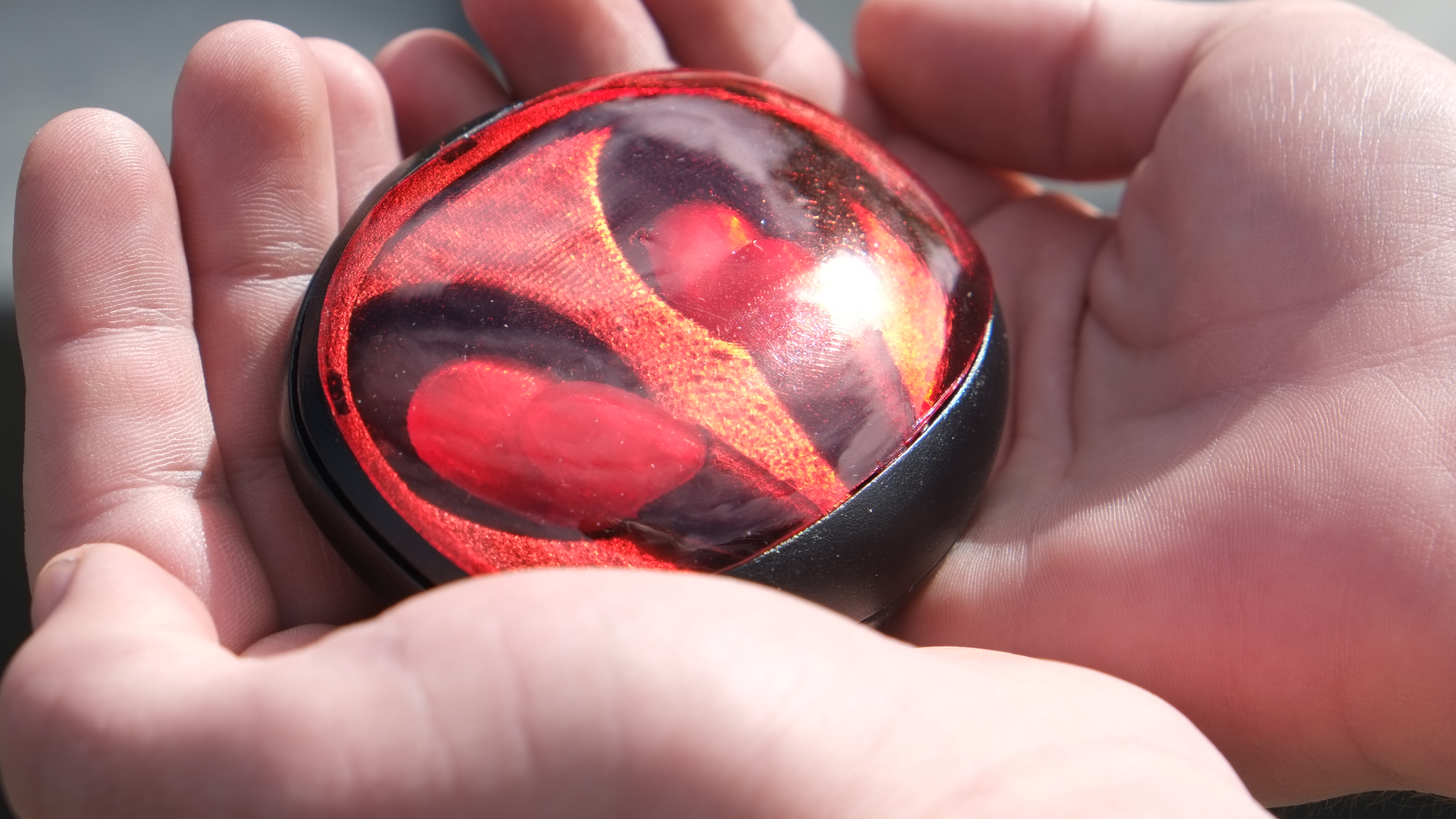 Within each pair, one earbud was unenclosed, and the other was encompassed in a soft silicone skin intended for the final product. One cosmetic model of the earbuds and their charging case was fabricated to visualize the CMF and form of the product, inspired by the teardrop shape of inflatable balloons and blimps, as well as the common red color of commercial balloons.