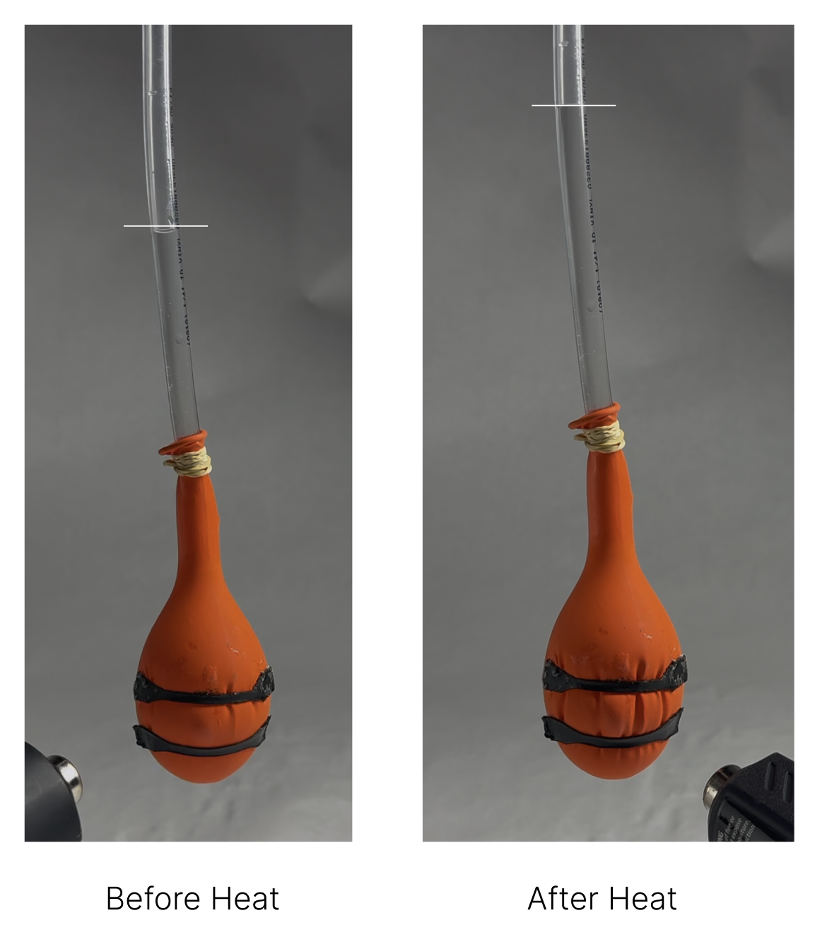 At the core of this project is a working experiment that mimics human physiology: two LCE strips were wrapped around a water-filled balloon connected to a vertical tube. When heat is applied, the LCEs contract, compressing the balloon and pushing water upward, an analogy for how calf muscles support blood flow back to the heart. This experiment laid the foundation for developing a real-world application of LCE-based actuation in compression therapy.